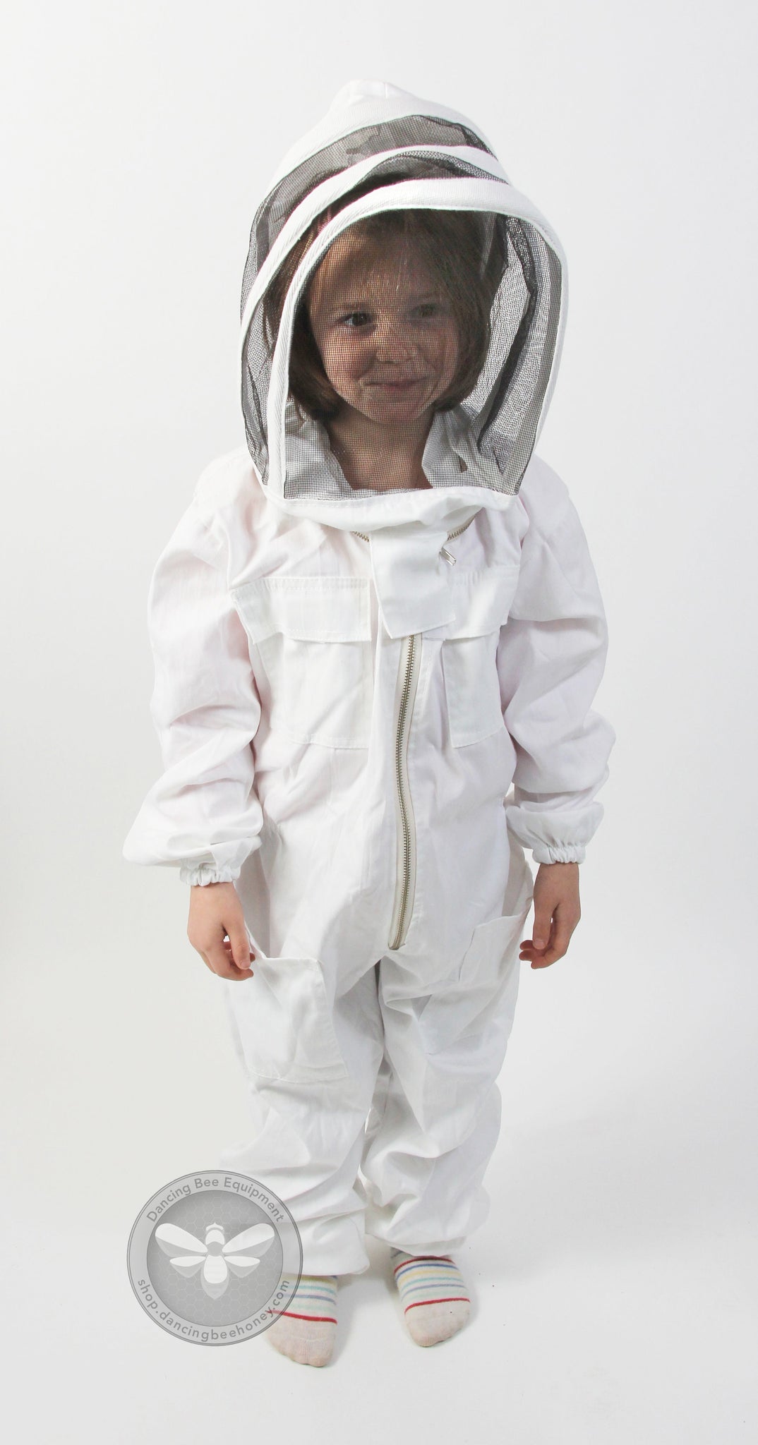 The Little Bee Steward suit offers exceptionally good overall protection. This suit is used by the children of Dancing Bee Staff members. It is perfect for fun beekeeping and educational days in the bee yard. It is made of robust cotton and a strong metal zipper. The hood offers comfort and a clear view. Elastic cuffs provide snug fitting without being too tight. Best Kid suit around.
