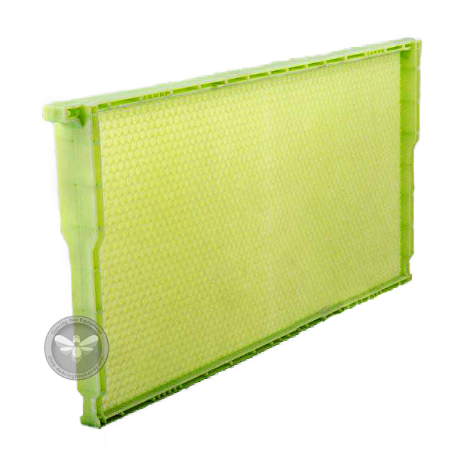 The drone comb frame was introduced as Integrated Pest Management (IPM) to fight Varroa mites without chemicals. Colonies instinctively build drone comb to maintain a healthy hive. Rotate frames in and out to manage Varroa mite levels. Bright green color makes it easy to identify drone frames. Simply remove the drone frames, scrape clean or freeze to kill and eliminate parasitic mites, and replace randomly.